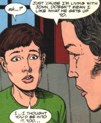 Kit Ryan, arguably the love of John’s life, came into public view in Hellblazer 42, which is a wonderful tale of camaraderie and drink in an old Irish tower reminiscent of some of the key sections in James Joyce’s Ulysses. Kit, an art student at that time, and far younger than John, was dating one of his best friends, Brendan Finn.