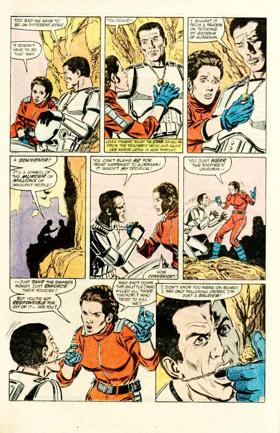 And that’s exactly what he did with “The Alderaan Factor”. Star Wars #86 was a stand-alone issue that focused on Princess Leia. She found herself stranded on a hostile planet and her only ally was a Stormtrooper who was tasked with taking her prisoner. However, Stradley took the helmet off this particular Stormtrooper and gave him a human face. Not only was he a person, but he was actually from Leia’s homeworld, Alderaan, which was destroyed in Star Wars: A New Hope. Both characters symbolically represented the factions that were battling for control of their galaxy. They each argued for their own side and the Stormtrooper, who actually never got named, presented a convincing argument in the favour of the Empire.