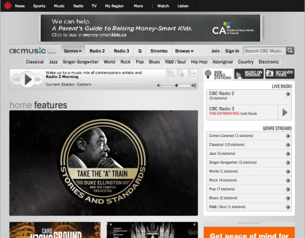 As a fairly active digital music consumer – I frequent iTunes, Rdio and Sirius Satellite radio online, as well as via their mobile-friendly apps – I have to say that I’m not terribly impressed with CBC Music. It took me almost five minutes to figure out how to navigate the radio stations and get the one I wanted to actually play. Then I found it quite odd that the site doesn’t tell you what track is playing at any given time. Even terrestrial radio in most modern cars has RDS (radio data systems) that display basic track info. NOTE: I notice that this feature isn’t available in my car when listening to CBC Radio 2 so maybe it’s a CBC issue.