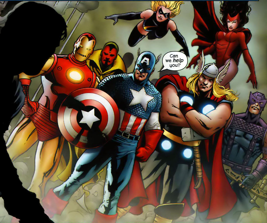There you go. Iron Man, Thor, Captain America, Dr. Henry Pym, the Wasp, the Vision, the Scarlet Witch, and Hawkeye. When you see these heroes together, you immediately think the Mighty Avengers, and this team also can handle anything thrown at them.