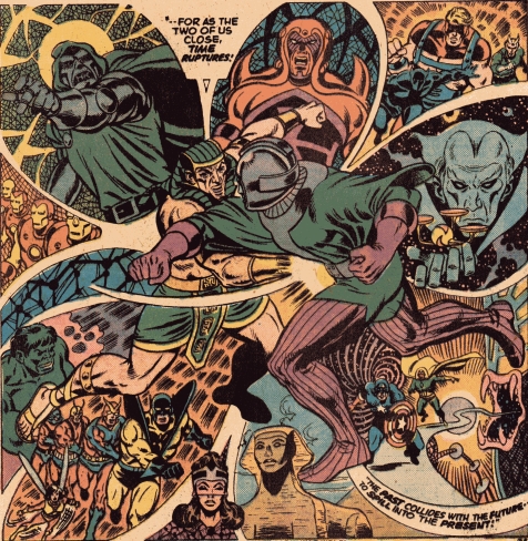 This is followed by five pages of caption-less pretty pictures. We see many alterations of Iron Man, Hank Pym, and Wolverine, as well as montages of various timelines and alternate universes. It pleasantly reminded me of the rare full page panel the late Dave Cockrum did waaay back in 1974, when Kang the Conqueror and Rama-Tut first clashed in Giant-Size Avengers #2. Yeah, Dave did it all in one panel.