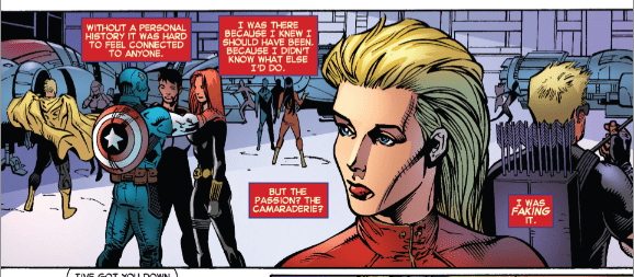 Carol is suffering serious psychic damage from a battle with her namesake’s archenemy Yon-Rogg, possibly most of her memories and emotions are gone, and that’s not even taking into account post-traumatic stress. She saves New York from this maniac before going off into deep space with the Avengers. She perseveres. The one thing Carol Danvers has always been, in all of her identities, is tough.