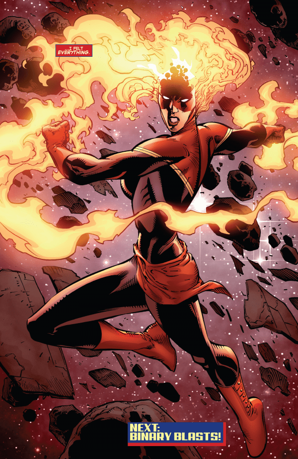Avengers #19 takes place in the aftermath of the Battle of the Corridor, where the Galactic Council forces got ambushed and decimated by The Builders. The Avengers also took a toll as well, eight of their number taken prisoner. One might suspect that Marvel’s checklist may be a little off as it appears this issue spoils the events of Captain Marvel #16. That may be wholly accurate however, as many of these events occur parallel to each other as opposed in a linear manner.