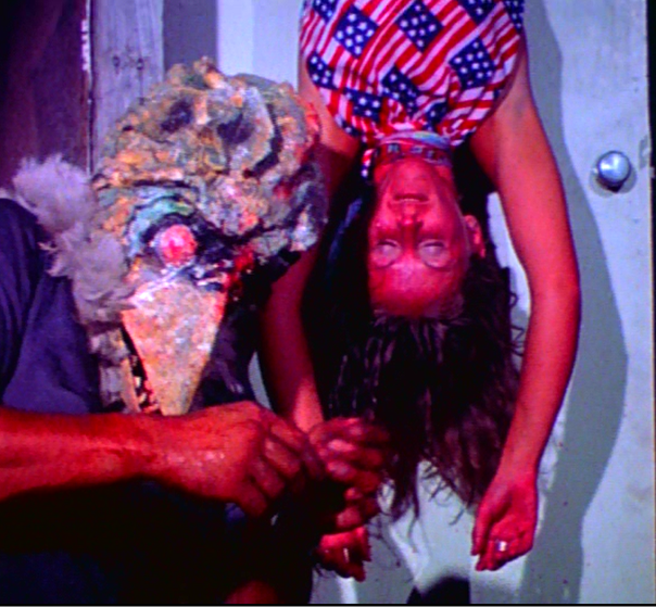 The combination of these dangerous drugs in Herschell’s system turn him into a turkey monster. Just writing it is ridiculous and painful. STEVE HAWKES runs around the neighborhood wearing a non-articulated full-head turkey mask, gobbling. The only thing that will satisfy the creature’s ghoulish hunger is murdering drug addicts and drinking their narcotic-infused blood. Herschell subdues a female heroin addict, hangs her upside down by her ankles, and slashes her throat. He cups his hands under the gouts of blood flowing from her opened veins and smears it all over his beak. This is probably because the mask wouldn’t allow STEVE HAWKES to open his beak, so he splashes the thin fake blood onto his face like an old woman dabbing rose water on her cheeks. He even gets it in his giant white turkey eyes that don’t blink, so the blood just stays there like a shame stain.